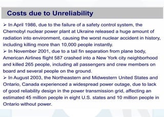 The document discusses reliability in mechanical engineering, defining it as the probability that a product can perform its function without failure over time. It highlights the importance of reliability engineering in design, testing, and maintenance to enhance longevity and minimize costs. Various parameters such as mean time to first failure (MTTFF), mean time between failures (MTBF), and mean time to failure (MTTF) are explained, along with probability distributions that model uncertainties affecting reliability.