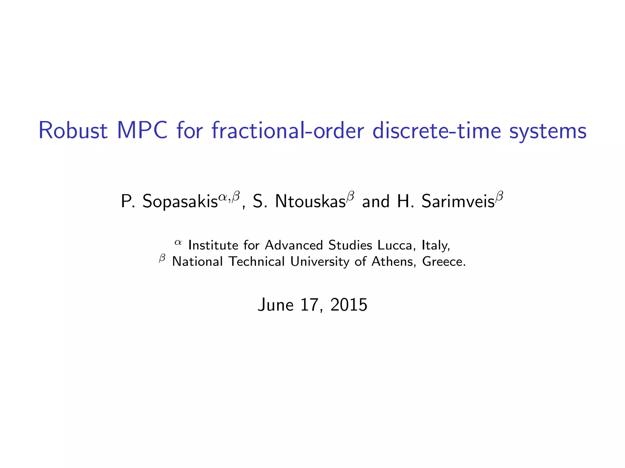 The document discusses robust model predictive control (MPC) for fractional-order discrete-time systems and introduces finite-dimensional approximations using fractional derivatives. It highlights the relevance of fractional systems in various applications, including pharmacokinetics and electromagnetic theory, and presents an MPC formulation that ensures constraints are met within a robustly positive invariant set. Simulations illustrate the approach's effectiveness, while also addressing ongoing questions regarding stability and application to controlled drug administration.