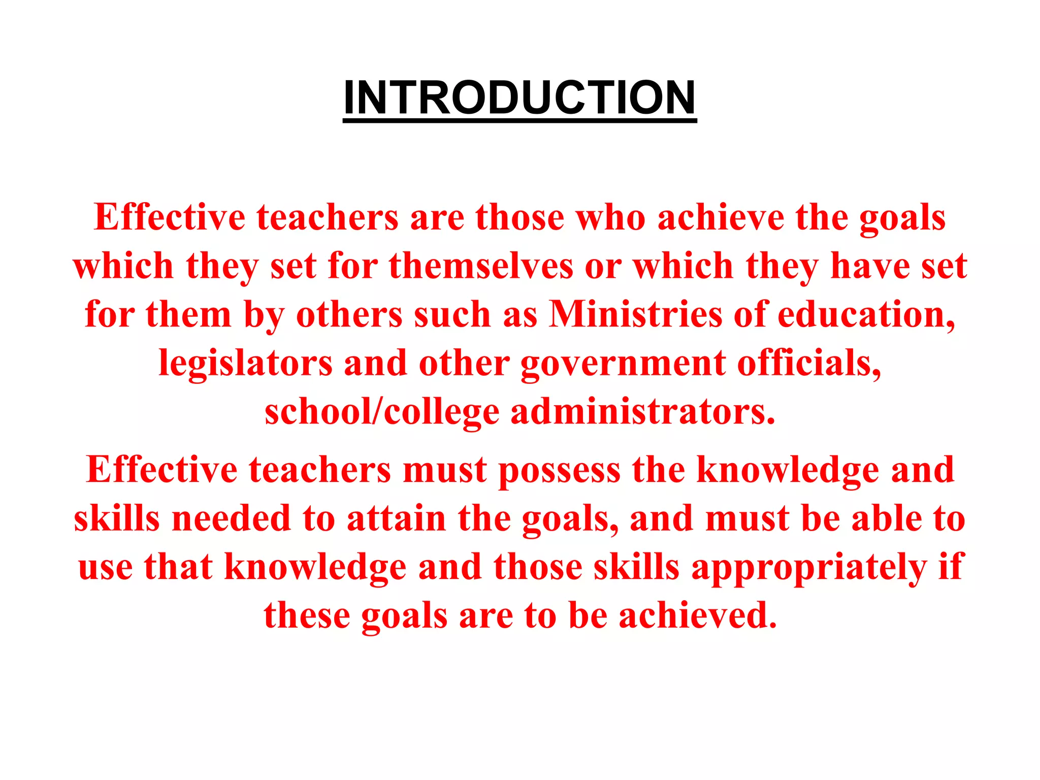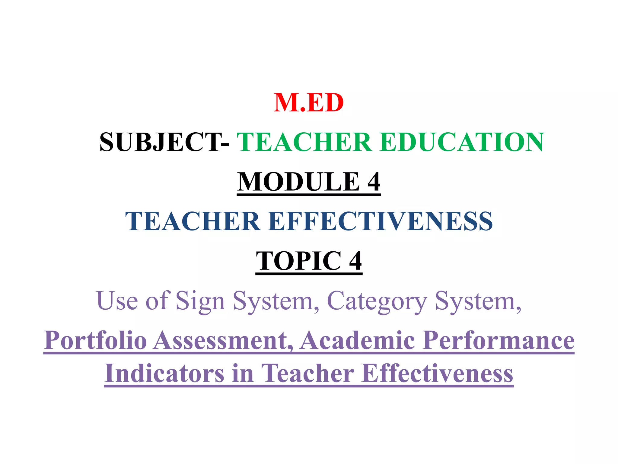 The document discusses teacher effectiveness, emphasizing the importance of teacher competence and performance in achieving educational goals. It details portfolio assessment as a tool for authentic evaluation of teachers, showcasing their skills and promoting reflection, while also addressing academic performance indicators to measure teaching quality and support professional growth. The conclusion highlights the need for continuous improvement in teaching practices to ensure effective education outcomes.