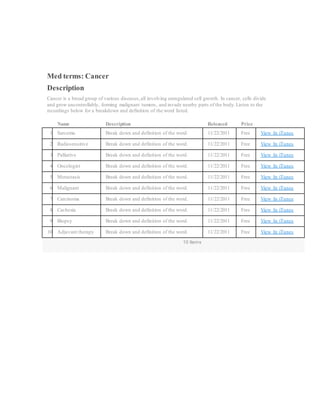The document provides descriptions and terminology related to various human organ systems, including the circulatory, cancer, musculoskeletal, respiratory, digestive, nervous, urinary, male and female reproductive systems. Each system is outlined with associated medical terms, along with a provision for audio recordings that define those terms. Additionally, it includes references to resources for further learning, such as an online medical terms course.