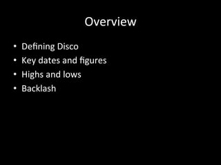 Disco emerged in the late 1960s and grew rapidly popular through the 1970s, with over 15,000 discos opening across the US. Disco nights brought together diverse groups on the dance floor to dance freely to percussive music. However, disco faced a backlash from social conservatives and was further damaged by its association with marginalized groups like the gay community as the AIDS crisis unfolded. While commercially successful, disco's inclusive culture challenged social norms and it was eventually replaced by new musical styles.