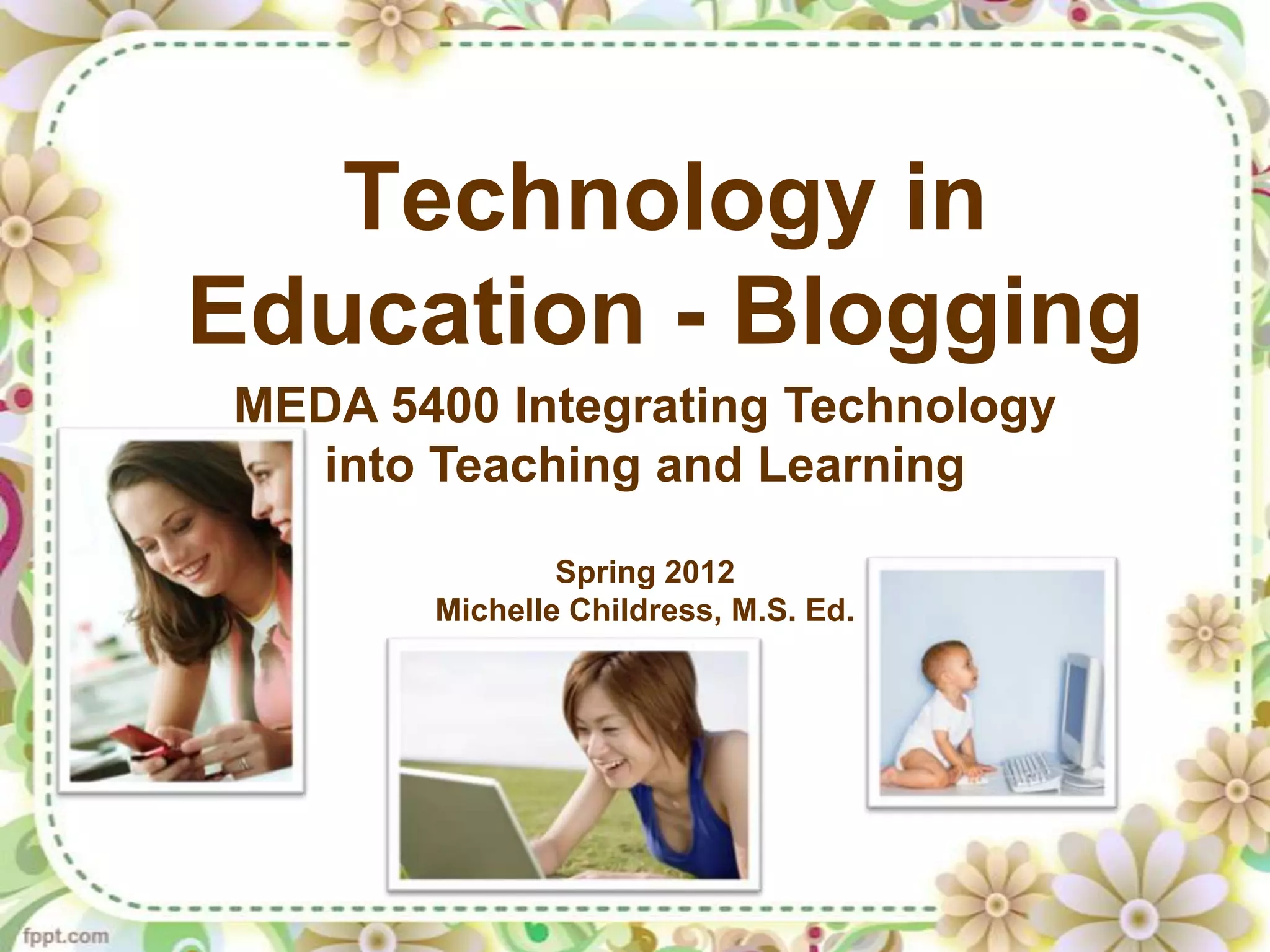 This document discusses the use of blogs in education. It begins by noting some lessons from history on technology in education, such as that technology does not fix problems and shows limited benefits. It then provides rationales for using technology, such as motivation and preparing students for the future. Key factors for effective technology use are alignment with curriculum, opportunities for collaboration, and support from teachers and schools. The document discusses what blogs are, how they differ from websites, how they are created, and examples of educational blogs. Reasons to create a blog include communication and showcasing student work. Potential drawbacks like assessment and student discomfort are also covered. Planning tips are provided like determining curriculum fit and increasing collaboration. Students will create their own blog