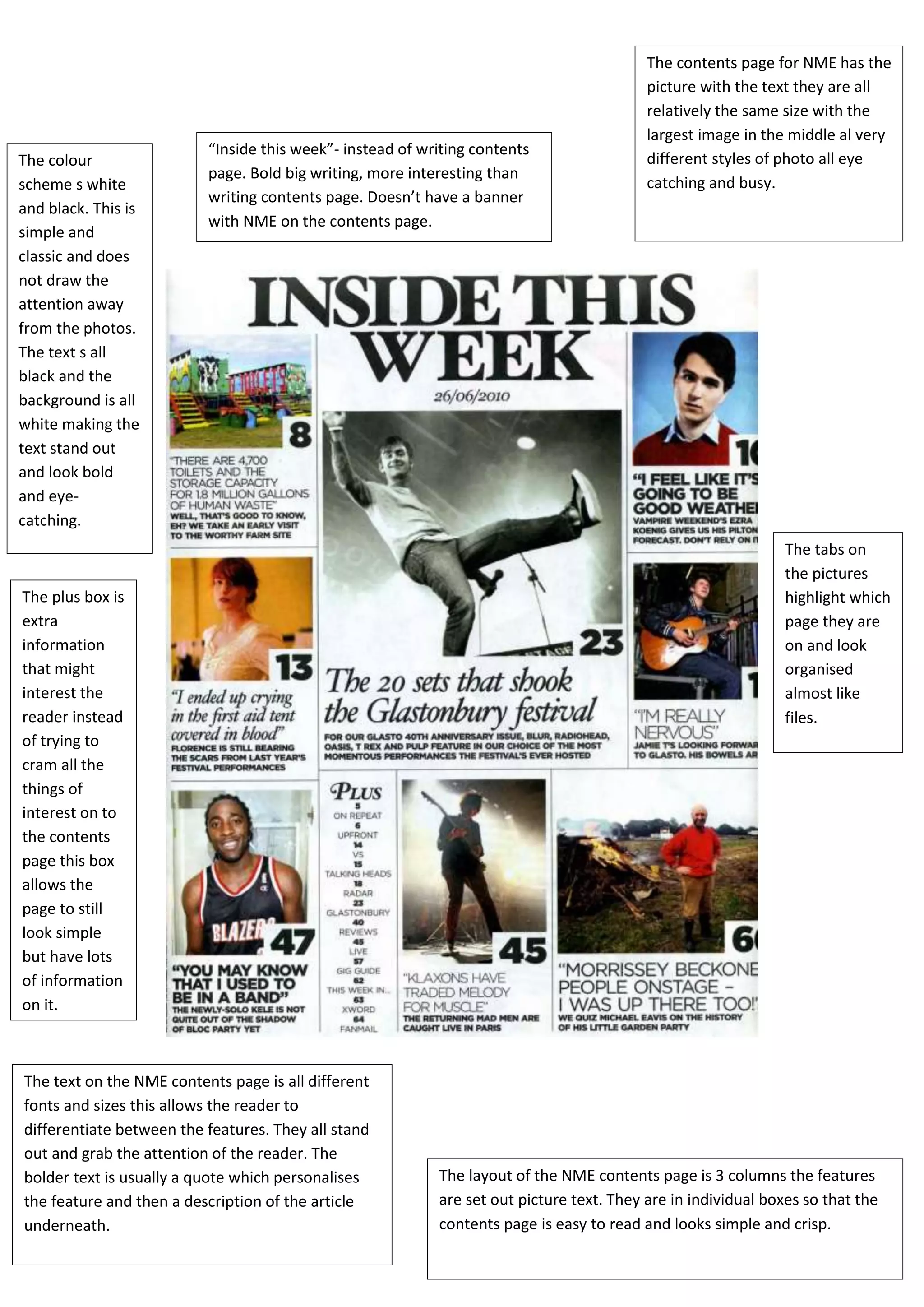 The NME contents page uses a simple black and white color scheme. It features large, eye-catching photos in the center with descriptions of articles. Additional information is provided in sidebars to maximize content without overcrowding the page. The varied fonts and sizes differentiate elements and grab readers' attention.