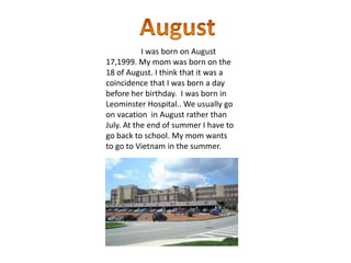 The document describes the narrator's life experiences, including being born near their mother's birthday, enjoying reading science fiction books, visiting grandparents in Florida which involves long car rides, traveling to Vietnam and Washington D.C. as a child, enjoying activities like going to Six Flags and zoos, and looking forward to starting high school.