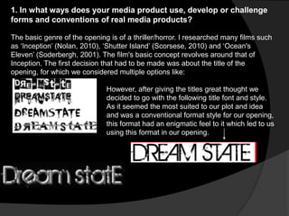 The document provides an analysis of a student media project evaluating how it uses and develops conventions of real media products. It summarizes the genre as a thriller/horror and how it was influenced by films like Inception. It describes the plot about a boy who can make his dreams come true. The opening sequence aims to be enigmatic through editing, effects, and following thriller conventions. It represents teenagers and challenges gender roles by portraying a vulnerable yet strong female protagonist. An industrial film distributor would be best suited to widely distribute the mainstream project. Throughout production, the students utilized various software and technologies for planning, filming, editing, exhibition, and audience research.
