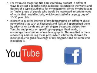 The document discusses how the author attracted and addressed their target audience for their music magazine ND. They aimed the magazine at 15-30 year olds interested in indie music. On social media, they promoted indie bands and singers to gain interest. The magazine included conventions like interviews to connect readers to artists. They featured up-and-coming singer Theo Lexis with photos taken in Camden, a popular indie location. Design elements like a large colorful logo and cover photo of singer Sophie were used to attract readers based on conventions of other music magazines.