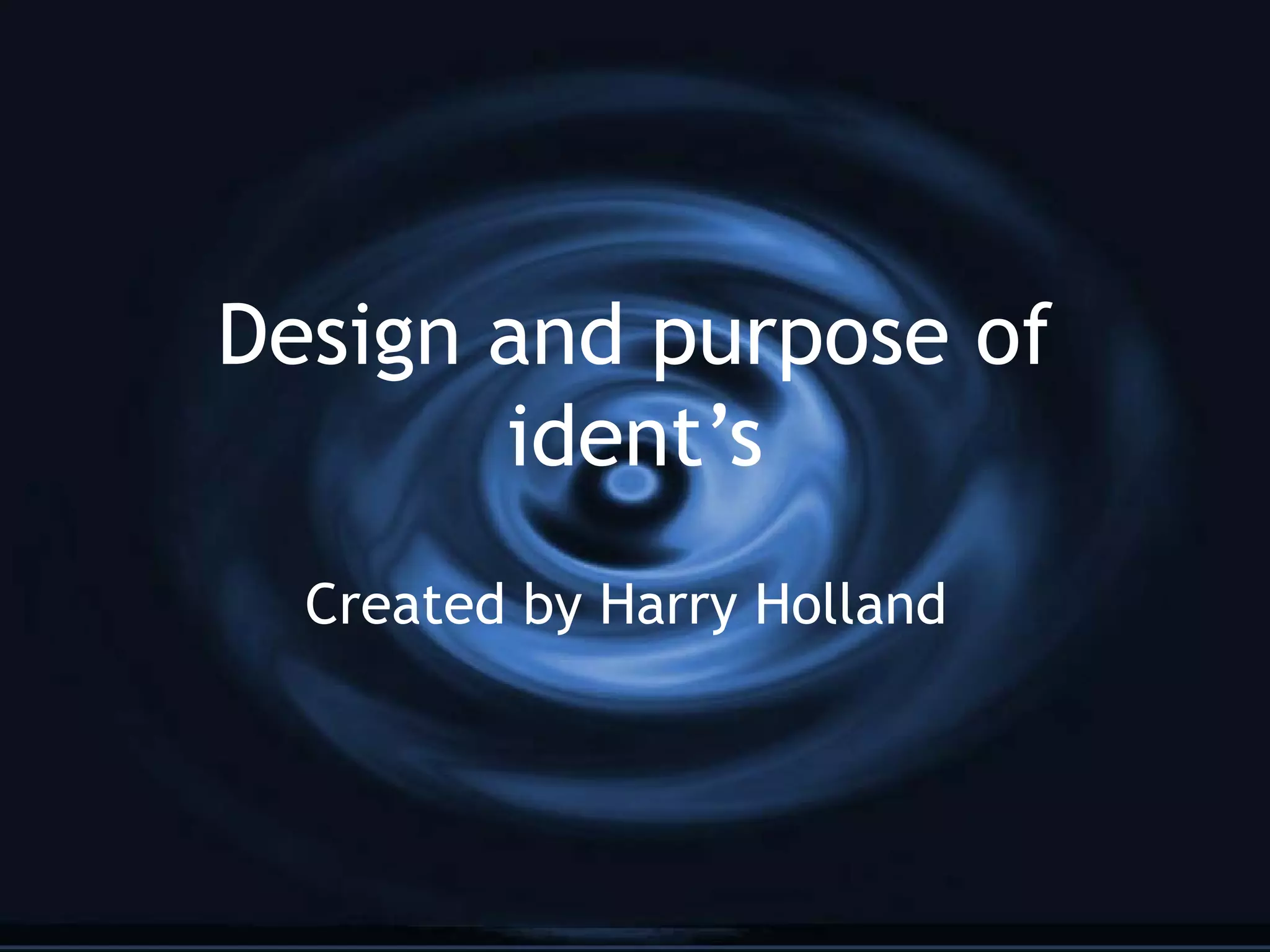 This document discusses the design and purpose of television channel idents. It notes that idents can have different tempos, from slow like the BBC 1 hippo ident to faster like the E4 ident. The length of idents can vary, like the Simpsons ident for Channel 4 being 39 seconds. Idents provide both information, such as announcing the next show, and entertainment. They can also interact with viewers and convey different densities of information. The main purpose of idents is branding, making the channel easily recognizable through colors and logos. Idents are important for packaging, segmentation within scheduling, marketing, establishing identity, and fitting into the scheduling of shows.