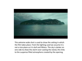 This document provides a summary and analysis of different shots from the film Shutter Island. It analyzes 9 different shots using descriptions of camera angles, lighting, colors, characters, and how they relate to the psychological thriller genre. Key details that establish the setting and tone include dull, dreary lighting; stormy skies; characters in a mental hospital in period costumes; and shots that create suspense, fear, and feelings of being trapped or confined.