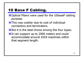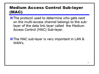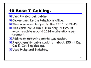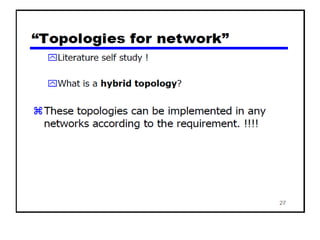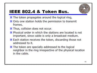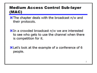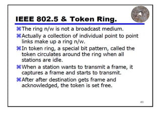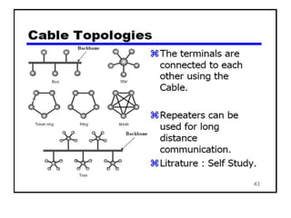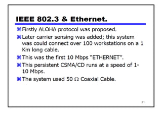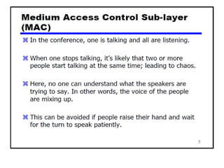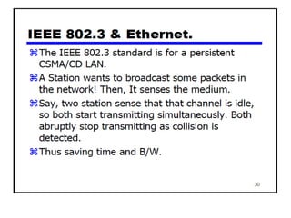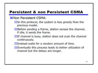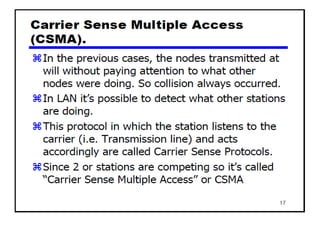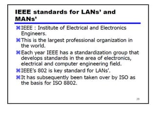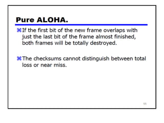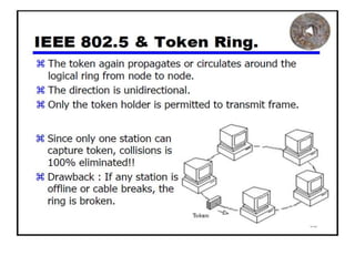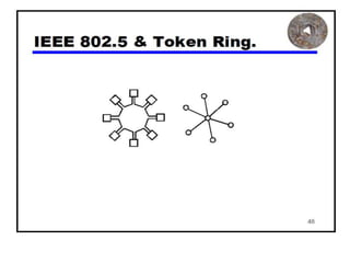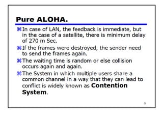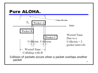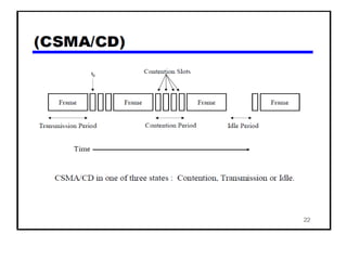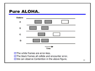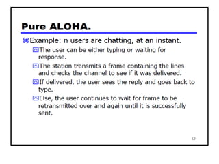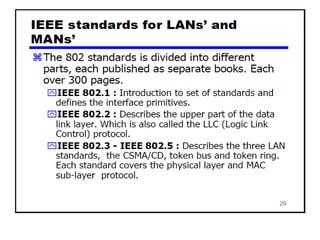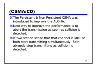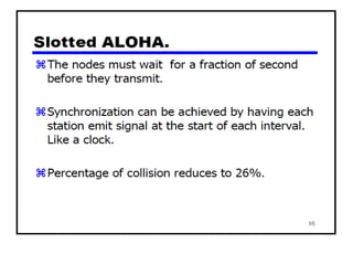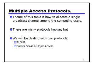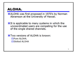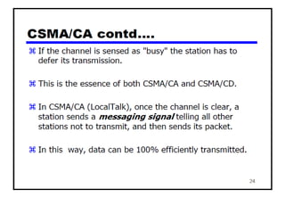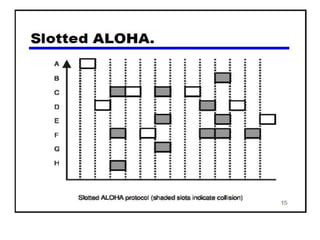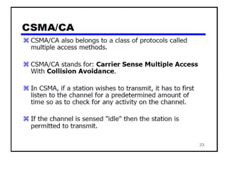 The document provides an overview of wireless networks and wireless communication technologies. It discusses the key elements of a wireless network including wireless hosts, base stations, wireless links, infrastructure and ad hoc modes. It also covers wireless link characteristics such as signal attenuation, interference and multipath propagation. Finally, it introduces common wireless network standards and protocols including IEEE 802.11 wireless LANs, wireless network characteristics such as the hidden terminal problem, and wireless multiple access protocols.