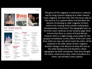 The magazine is a special anniversary edition celebrating 40 years. It maintains the publication's house style through elements like a photo from an older issue and a theme of a birthday cake with 40 candles. The contents page continues the minimalist color scheme and clear layout of the cover to aid navigation. The articles are meant for an audience of classical music fans and professionals given their informational nature.