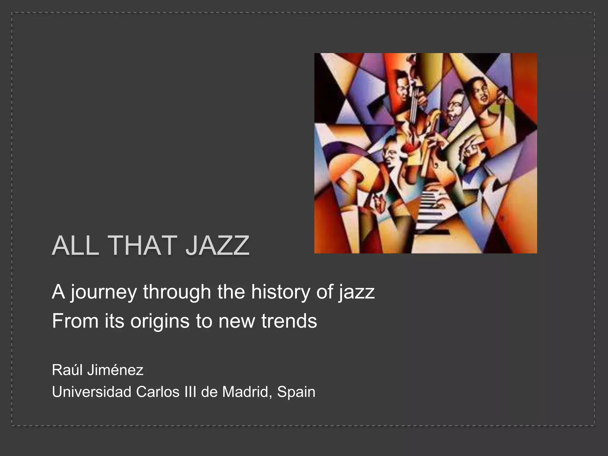 This document outlines a 10-week course on the history of jazz music. The course will take students on a journey from the origins of jazz to new trends, exploring how jazz music has evolved alongside major 20th century events. Students will gain an understanding of jazz through lectures, assigned readings, videos, mp3s, and by attending live concerts. The course director will curate high-quality materials and tie them together with a clear narrative or screenplay. The goal is for students to feel the music and have a fantastic educational experience that illuminates both the art and drama of jazz's development over time.