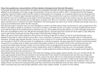 Over the last 50 years, audience consumption of media has changed drastically. People now have more choices and easier access to media through new technologies like the internet, smartphones, and hundreds of TV channels. Fifty years ago, people had to go to the cinema to watch films, only had a few TV channels to choose from, and could not easily contact others outside their homes. While these new technologies provide more options, they have also disrupted traditional media industries like newspapers, magazines, films and TV.