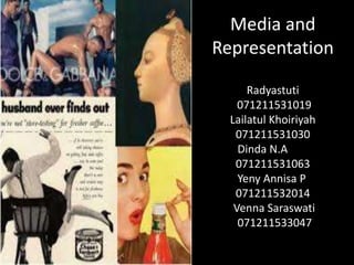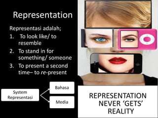 Dokumen ini membahas konsep representasi dalam media, menjelaskan bagaimana berbagai media membentuk pemahaman kita tentang realitas dengan cara yang berbeda. Setiap media memiliki metode produksi yang unik, yang mempengaruhi sudut pandang yang ditampilkan. Selain itu, fakta dan fiksi dalam media sering kali saling bercampur, sehingga perlu dilakukan dekonstruksi kritis untuk membedakannya.