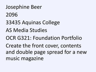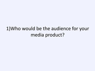 This document discusses the development of a media product - a new music magazine. It provides details on the intended audience, which is described as being aged 14-18 and having interests in pop, chart, and hip-hop music. The document discusses how the magazine would represent this social group through the choice of cover model, photos, and musical artists featured. It also addresses how the magazine would be promoted and distributed through various media institutions and platforms like social media, apps, and YouTube to engage its target audience.
