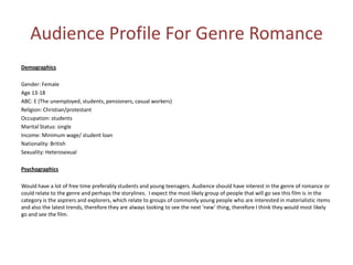 The document provides information about the target audience for romance genre films and trailers for several romantic films including Crazy Stupid Love, The Notebook, and Wall-E. The audience for romance films is described as primarily female, aged 13-18, students or low-income workers. The trailers are then analyzed and summarized as conforming to romance genre conventions through themes of love, relationships, and happy endings. Production details like budgets and box office earnings are also listed for some films.
