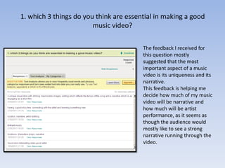 The document summarizes the results of a survey about audience preferences for country music videos. Key findings from the survey include that respondents felt narrative, costumes, and lighting were most important aspects and that music videos should have a balance of artist performance and narrative. The survey results will influence the creator's upcoming country music video to include elements of both relaxation and excitement that appeal to a broad audience.