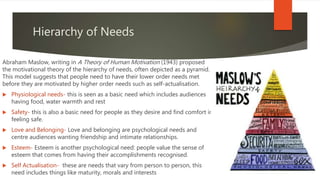 1) Maslow's hierarchy of needs proposes that people must have their basic physiological and safety needs met before pursuing higher needs like belonging, esteem, and self-actualization. Early media theories viewed audiences as passive and easily influenced.