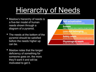 - Maslow's hierarchy of needs proposes that basic physiological needs must be met before higher-level needs.