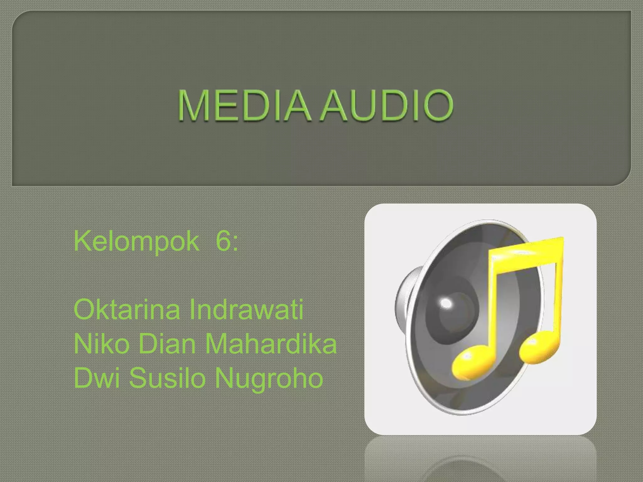 Dokumen tersebut membahas tentang media audio yang meliputi definisi, jenis, keunggulan, dan kelemahan media audio serta tahapan pembuatan media audio pembelajaran. Media audio adalah media yang menyampaikan pesan secara auditif melalui indera pendengaran seperti radio, kaset, CD, dan laboratorium bahasa.