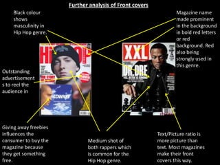 The document analyzes front covers, double pages, and contents pages of hip hop magazines. Some key findings include: