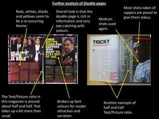 2) Double page spreads contain rich visuals and eye-catching colors to engage readers. Medium shots of rappers are often used to give them status.