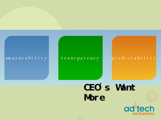 The document discusses improving marketing accountability and effectiveness to impact business performance. It outlines six common reasons why marketing accountability efforts fail, including not measuring what matters and not focusing on decision making. The document recommends classifying existing marketing investments based on effectiveness, increasing spending on proven effective investments, and using experimentation to validate unproven investments. It also stresses the need for capabilities, processes, analytics, and data to systematically improve marketing accountability over time.