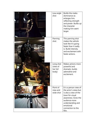 The document discusses various cinematic shot types and their effects on storytelling, including close-ups, wide shots, and low angles. It emphasizes how these techniques enhance audience engagement by building suspense, conveying character emotions, and providing context. The descriptions illustrate the impact of camera angles on perception and dramatic tension within a film.