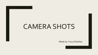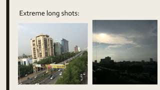 Camera shots include establishing shots from a distance, medium shots from a moderate distance, medium close-ups that show some details of the subject, and close-ups that focus on a small area or object. Other shots are birds-eye views from above, over the shoulder shots behind a subject, point of view shots through someone's eyes, and two shots that show two subjects or objects in the same frame.
