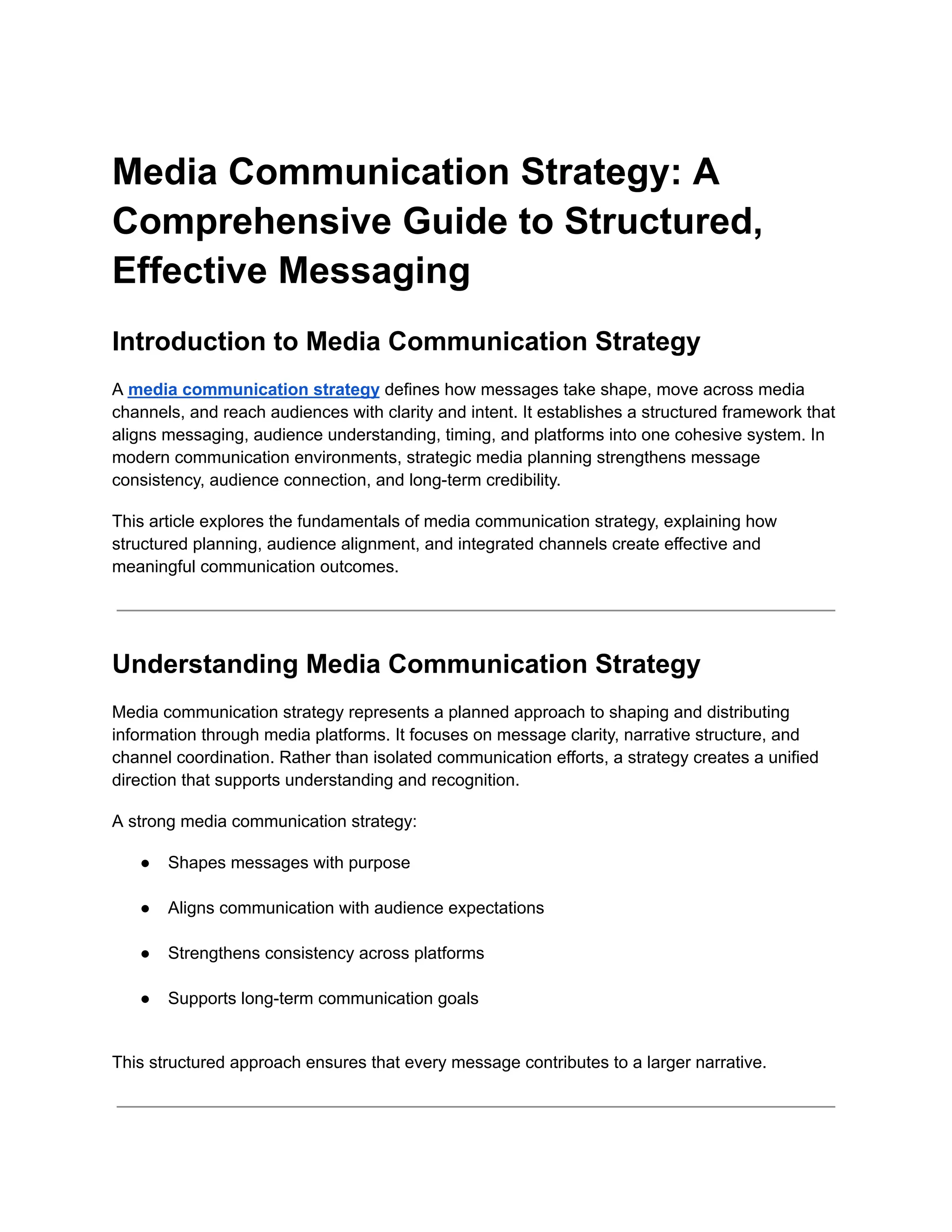 Media communication strategy defines a structured approach to shaping, delivering, and sustaining messages across media platforms with clarity and consistency. It focuses on aligning communication goals with audience understanding, message relevance, and channel selection. A well-defined strategy guides how information flows through earned, owned, and shared media while maintaining a unified narrative. It emphasizes audience analysis, message development, timing, and ethical communication standards. Through integrated planning and continuous evaluation, media communication strategy strengthens message visibility, reinforces credibility, and supports long-term engagement. This strategic framework enables clear storytelling, informed decision-making, and meaningful connections within an evolving media environment.