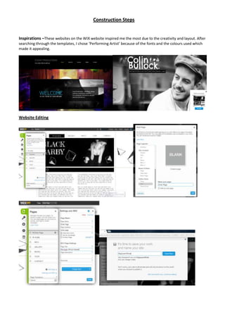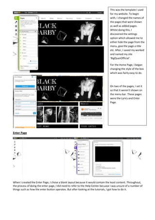 The document describes the process of constructing a website for a musician named Big Quan using the WIX website builder. Key steps included choosing a template, editing pages, adding content like images and text, and linking pages. Functions like adding headers, menus, and galleries were utilized. Testing different designs and getting help from tutorials was part of iterating on the site layout and features. Screenshots provide examples of the constructed home and enter pages. The overview covers customizing each page like About, News, Music, Gallery, Video, Connect and Store sections.