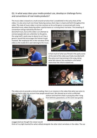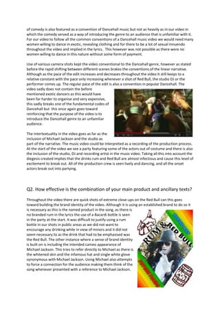 The music video challenges conventions by using a nonlinear narrative with short clips cut together. It aims to introduce unfamiliar audiences to dancehall music through a comedic tone. While it uses conventions like various camera shots and pacing tied to the music, it lacks revealing costumes and sexual content common to the genre. Product branding for Red Bull and rum is prominent. Audience feedback showed interest in star appeal, so a cameo of Michael Jackson was included for recognition, though his depiction was exaggerated for comedy. The video, poster, and album packaging aim to broadly appeal while representing the target 16-19 demographic experience of partying with friends.