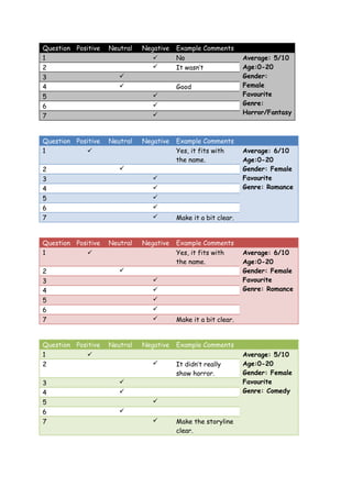 The document appears to contain survey responses from multiple people about various films or videos. Each response includes ratings of positive, neutral, or negative for 7 questions. Additional comments are provided in some responses about aspects like the average rating, age and gender of the respondent, their favorite genre, and specific feedback on elements like the storyline, editing, sound, and more. Overall impressions and ratings vary across the responses.