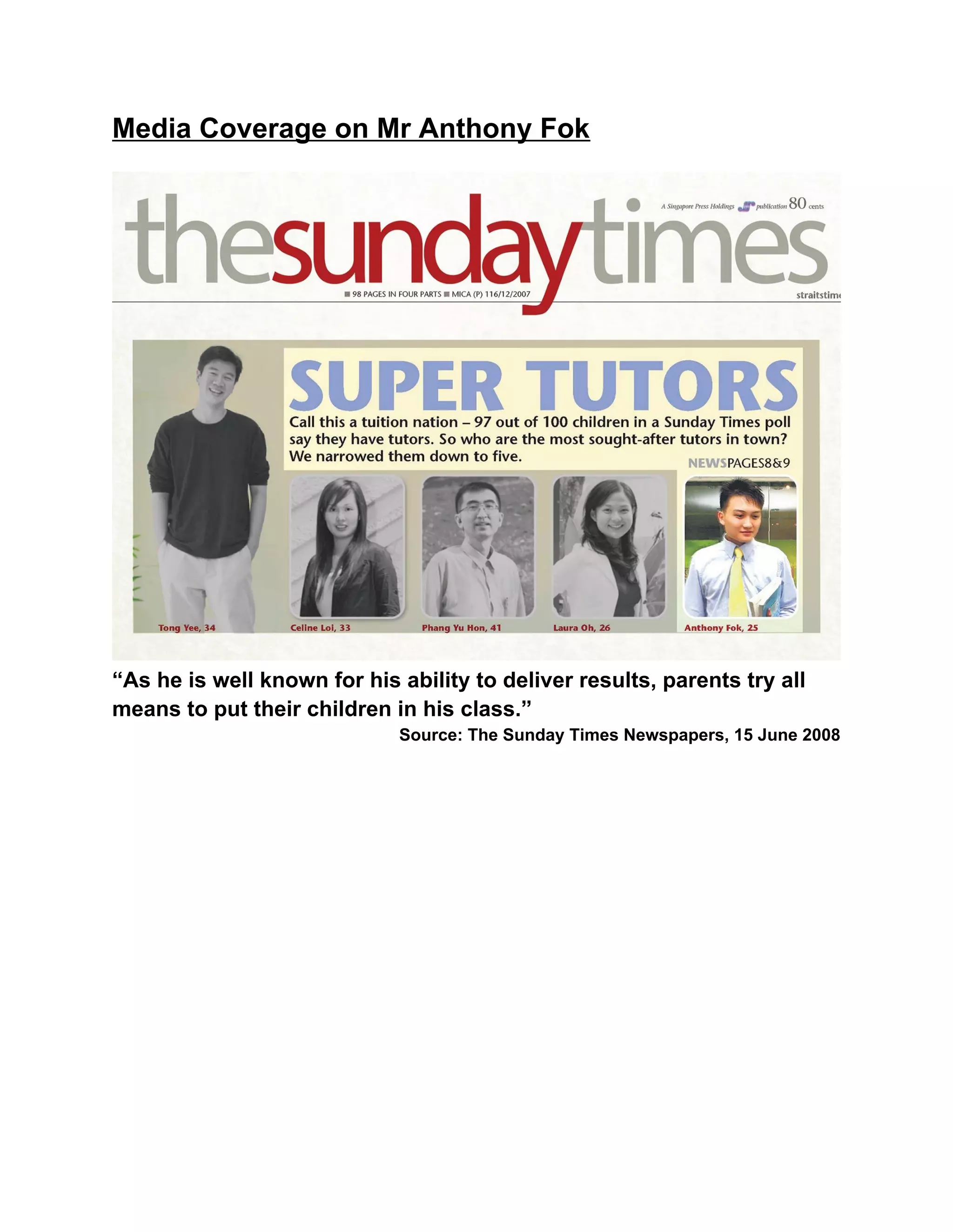 Mr. Anthony Fok is recognized for his exceptional ability to deliver results in education, leading parents to seek enrollment for their children in his class. His effectiveness has been highlighted in various media outlets, including The Sunday Times and The Friday Weekly. Articles discussing his impact have appeared from 2008 to 2014.