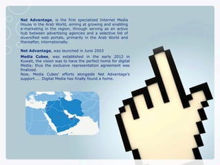 Net Advantage is a specialized internet media house in the Arab world that focuses on e-marketing by connecting advertising agencies with diverse web portals. Launched in 2003, it includes prominent sites like kooora.com for sports, hawaaworld.com for women, and aljazeera.net for news, each with significant traffic and targeted demographics. The portfolio aims to provide effective advertising opportunities across various audience profiles while maintaining a strong online presence across the region.