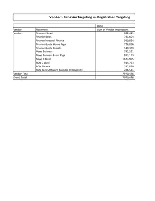 This document provides analytics data for a vendor comparing behavior targeting to registration targeting. It shows impressions, click-throughs, conversions, and other engagement metrics for various content placements. In total there were nearly 8 million impressions for the vendor, with the highest being over 1.6 million for the News C Level placement. Engagement rates such as click-through rate and conversion rate varied across different placements.