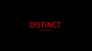 The document discusses key elements of the horror genre including common settings, technical aspects, iconography, narrative structures, character types, and themes. Typical horror settings include isolated areas at night with a hidden past like graveyards, which create a scary atmosphere. Technically, horrors use dim lighting, odd camera angles, and close-ups to establish an uneasy feeling. Iconographically, horrors feature weapons, blood, dark costumes, and a blue filter to add creepiness. Narratively, horrors have mysteries, cliffhangers, and incomplete plots leaving the audience wondering and allowing for sequels. In terms of characters, horrors feature stereotypical roles like "the hot blonde" and "the black guy." Common horror themes center