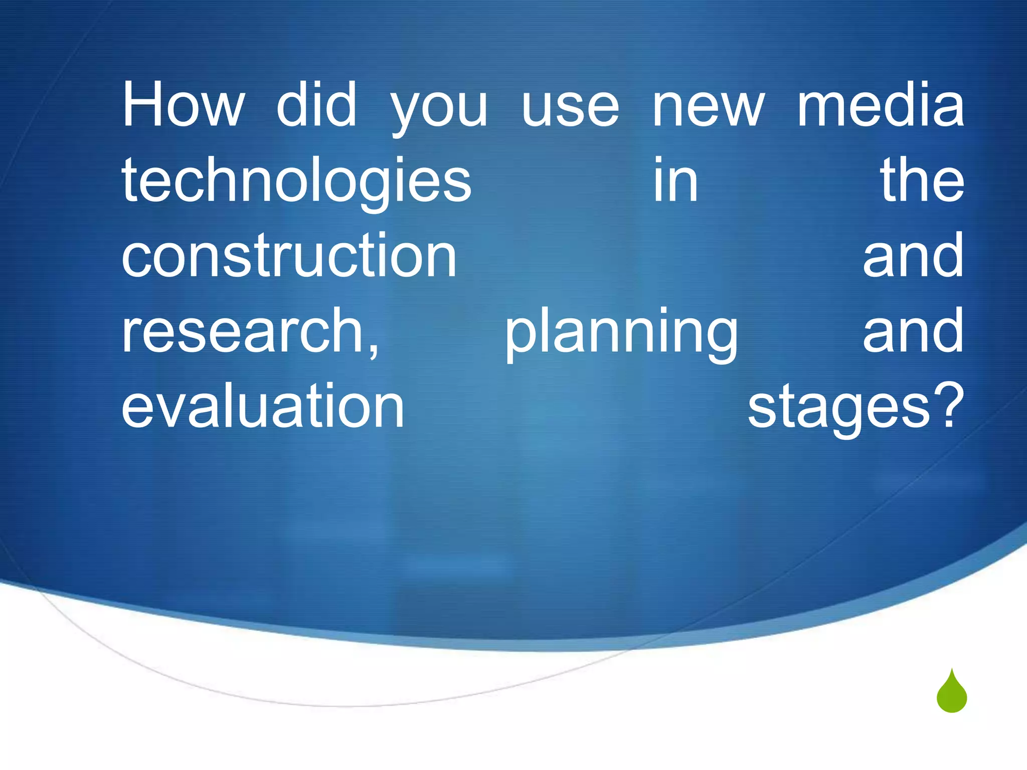This document discusses the use of new media technologies in creating a music video. It summarizes the various technologies used in the research, planning, production and evaluation stages including search engines like Google to find inspiration, YouTube to study other videos, cameras to film footage, editing software like Final Cut Express to assemble the video, Wordle to generate word clouds for the blog, social media like Facebook to promote and get feedback on the video, and SlideShare to create the presentation documenting the process. The document outlines how each technology was utilized to construct, research and plan the music video project.