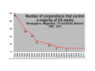 This document provides information on media mogul Rupert Murdoch and his acquisition of numerous newspapers, television stations, and film studios over several decades to build a massive media empire. It also summarizes key concepts in media economics like monopoly, oligopoly, deregulation, and trends in business practices such as outsourcing, wage gaps, and media consolidation.