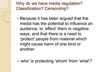 This document discusses media effects debates around regulation, classification, and censorship of media. It outlines three perspectives in the debate - those who articulate concerns without evidence, researchers who study media effects, and media consumers like children. The key distinction is drawn between regulation, classification, and censorship. Psychological and sociological approaches to media effects are also discussed, as well as how effects on individuals can impact society. Classic effect theories are outlined along with criticisms of effects-focused approaches.