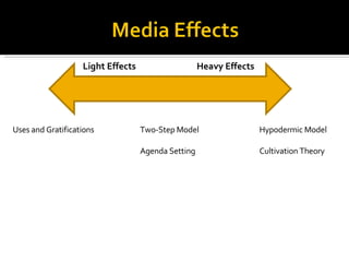 1. The hypodermic needle model suggests media can precisely inject ideas into passive audiences.