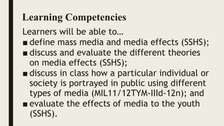 This document discusses various topics related to media and media effects, including: