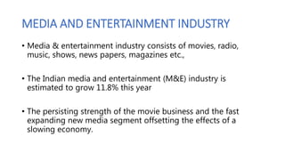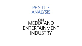The document discusses a PESTLE analysis of the media and entertainment industry in India. It analyzes how political, economic, social, technological, legal, and environmental factors impact the industry. Politically, the media influences public opinion and debates with leaders. Economically, the industry is growing 11.8% annually with foreign investment allowed. Socially, the media can manipulate behavior. Technologically, advances like AI are transforming content creation and experience. Legally, intellectual property laws must be followed. Environmentally, productions aim to reduce their carbon footprint.