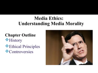 The document discusses the history and ethical principles of media, highlighting various controversies and ethical dilemmas faced in journalism, advertising, and entertainment. It covers significant events such as ethical breaches, the rise of standards in media, and the evolution of ethics from the print era to the digital age. Key ethical frameworks discussed include absolutist ethics, situation ethics, and the concept of conflicting loyalties among media practitioners.