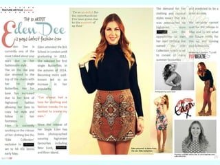 My magazine represents teenage girls through its content, style, and visuals. The magazine uses feminist colors like blue, pink, and purple throughout and features pictures of a fashionable teenage girl to relate to its target audience. While only featuring one model, different outfits represent various styles. The magazine aims to attract a wide teenage girl audience by focusing on popular genres like pop and fashion that research showed most teenage girls are interested in. The magazine cover similarly features a casually posed female model in a fashionable outfit surrounded by titles, using colors that appeal to teenage girls.
