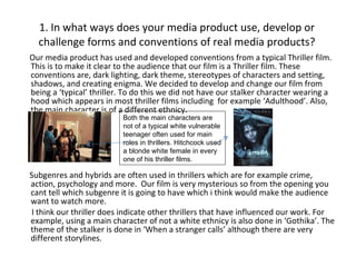 The document discusses the production of a media studies project titled "The Pursuit" which is a thriller film. It summarizes how the film uses conventions of the thriller genre like dark lighting and themes while also challenging conventions by having a non-white main character. It discusses how the film represents teenagers and aims to raise awareness of safety issues. It also outlines the target audience, how the audience was attracted through realistic scenes, and what was learned about film technologies through the project.