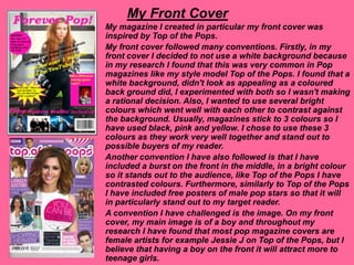 The document discusses the media product of a magazine front cover, contents page, and double page spread created by the author.
