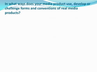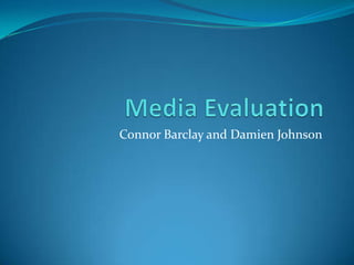 The document discusses the media production of Connor Barclay and Damien Johnson. It covers how they used conventions of horror/thriller genres in their poster and radio trailer. It also discusses how they developed conventions through their chase scene and challenged conventions through a lack of dialogue and diegetic sound. The document then covers their use of various media technologies in the research, construction, and evaluation stages of their project. This included using YouTube, Final Cut Express, GarageBand, and other tools. Finally, it summarizes the positive feedback received about the story, editing, soundtrack, camerawork and how it conveyed the psychological nature of the story.