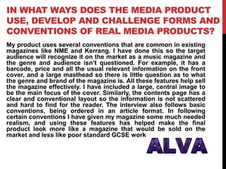 Luke Thomas has created a music magazine called Alva aimed at young adults aged 15-25 who enjoy punk, indie, and rock music. To attract this audience, the magazine uses conventions like barcodes and mastheads but also unconventional features like colorful comic book-inspired designs. It represents its target audience by using simple writing and images of young people. The magazine would likely be distributed by an established company like Bauer or IPC Media to reach a wide national audience. Through constructing this magazine on Photoshop, Luke has learned how to make the design look more polished and professional.