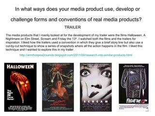 They analyzed existing horror media products like films and magazines to identify codes and conventions they could incorporate. Their trailer uses techniques like tension-building music and quick cuts seen in real trailers.