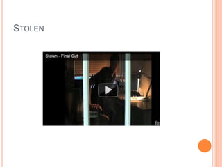 The document provides an evaluation of a media product titled "Stolen" created by Danielle Gallagher. It summarizes how the product used and developed conventions of the psychological crime thriller genre. It analyzed elements like camera work, titles, lighting, costumes, and characters to represent stereotypes and attract its target middle-class audience of 15+ year old males and females. The evaluator believes the product could be distributed by film companies like New Line Cinema or Film4 and garner interest from those who enjoy thrillers with similar conventions like Misery. Feedback on an early cut praised the music, titles, and ability to engage and intrigue the audience about what would happen next.